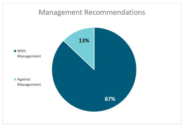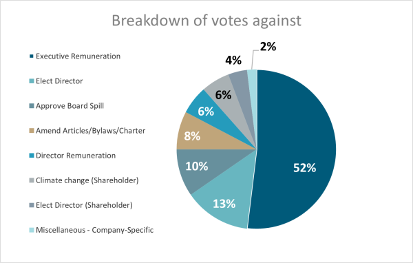On executive remuneration, an example where we voted against management recommendations was for an Australian real estate company regarding multiple resolutions to approve the bonuses paid to executives. This was due to the significant level of bonuses paid over the year when there was a fatality reported. In addition, the magnitude of the long-term incentive payment continues to be excessive relative to peers. The resolution still passed in the end receiving 65% shareholder support.