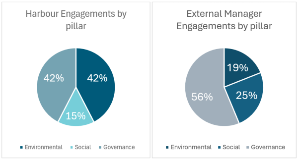We have also measured the engagements conducted by our external managers utilised in our global and multi-asset funds with pillar breakdowns provided below. There were 1418 total engagements across these managers with a higher proportion focused on governance compared to our in-house engagements that had a balanced proportion with environmental issues.