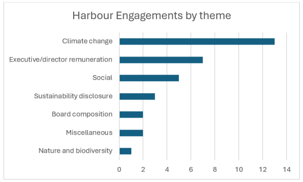 The most prevalent voting resolutions that were contentious over the year related to executive remuneration followed by the election of directors. There was a similar amount of shareholder resolutions filed compared to the previous reporting period for companies in Harbour funds with these largely focused on climate change.