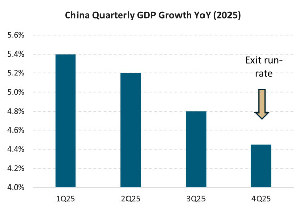 The GDP growth target for 2026 has not yet been set, and should be published in early March, during the National People’s Congress (NPC). The new target is expected to be in the 4.5% to 5% range (was ‘around 5%’ in 2025). Whatever the target is, it gives a pretty good indication of where growth is heading and the amount of stimulus that might be needed to get there. With geopolitical uncertainties still very much a risk to growth rates, it is reasonable to think policymakers will retain some dry powder until the second half of the year in the event they find themselves trailing the target.