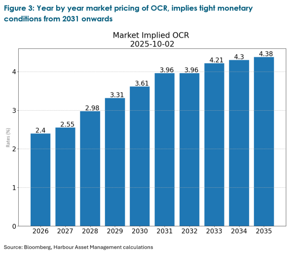 However, for both groups, analysis will include taking note of the shape of the yield curve. In effect this is largely the market’s assessment of the future path of the OCR. Will it stay low for a long time and how fast might future interest rates rise, if indeed the OCR does not need to go even lower than is currently priced into the market? Our observation is that the NZ yield curve is quite steep and, perhaps surprisingly, expects the OCR to be back above 3.5% in 5 years’ time, climbing to above 4% in 10 years’ time. That includes an expectation that the RBNZ will begin hiking the OCR in late 2026. The idea that we move back into a situation where monetary policy is persistently tight surprises us.