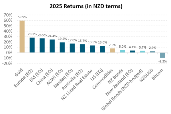 This is less one to watch for the future, but rather what we have been watching over the past year. Our chart captures the striking contrasts in 2025 returns across major asset classes. It has been another lacklustre year for New Zealand equities, with local bonds outperforming NZ shares for the third time in four years – let’s hope 2026 is not another repeat. In Australia, sector dispersion has been extreme – healthcare fell more than 20%, while resources surged over 20%, underscoring the importance of active positioning.